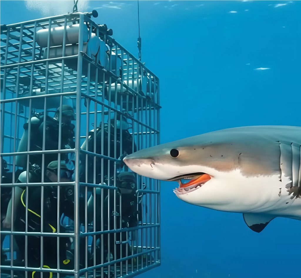 Un gruppo di turisti in cerca di emozioni forti aveva scelto un’esperienza unica: immergersi in una gabbia rinforzata per osservare da vicino i predatori marini. La struttura, costruita con acciaio industriale, doveva resistere anche alle creature più aggressive — almeno così avevano garantito gli organizzatori.