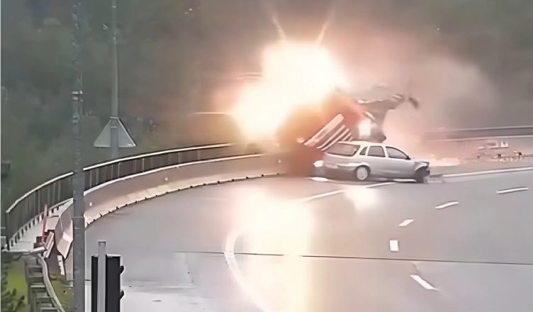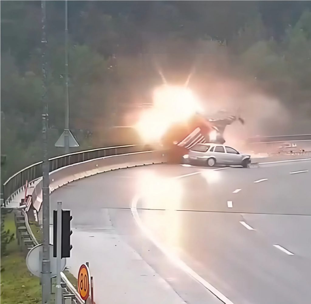 Le telecamere di sorveglianza piazzate a un incrocio trafficato hanno ripreso una scena che avrebbe fatto il giro del web in poche ore. Si vede un camion enorme sfrecciare fuori da una curva — non solo a velocità elevata, ma completamente fuori controllo. Nessun segno di frenata. Nessun rallentamento. Solo una corsa cieca e un silenzio sinistro prima dell’impatto.