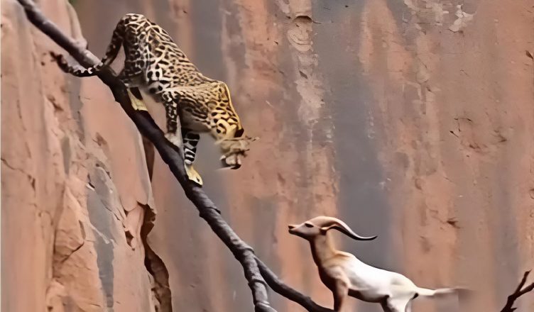 Tutto è iniziato durante una normale escursione. Un gruppo di turisti, accompagnati da una guida locale, stava percorrendo un sentiero di montagna quando avvistarono un leopardo in agguato tra le rocce. L’animale aveva già puntato il suo bersaglio: un piccolo gruppo di stambecchi che pascolavano su un pendio roccioso. Uno di loro, leggermente separato dagli altri, si trovava nel punto peggiore possibile — proprio sul bordo del burrone.
