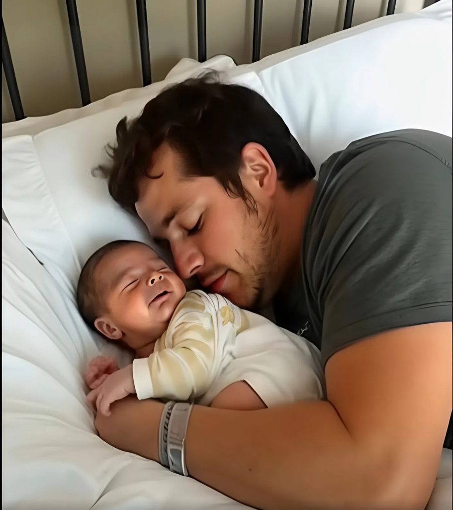 Un neonato, avvolto in una copertina azzurra, dormiva profondamente, con un cuscino sistemato accanto per non farlo rotolare.