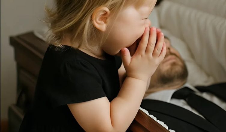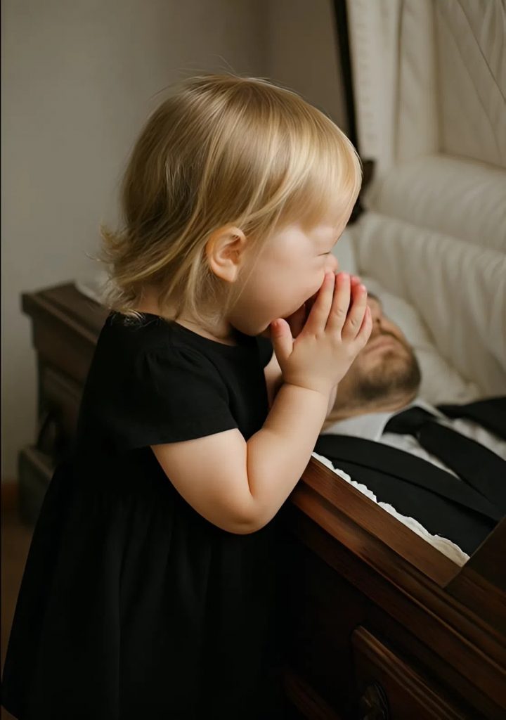 Accanto alla bara c’era sua moglie, immobile, il volto pallido e gli occhi vuoti. Ma accanto a lei c’era qualcuno che attirava sguardi ancora più pieni di dolore — la loro bambina di due anni. Un vestitino nero, i riccioli sciolti, una bambola in mano. Non piangeva. Non parlava. Guardava soltanto, aggrappata al bordo della bara.