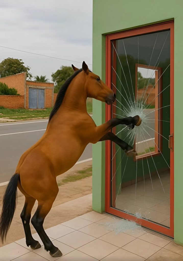 Un cavallo sfondò il vetro.
