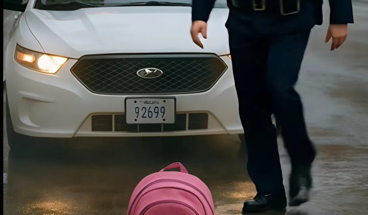 Improvvisamente, all’incrocio deserto, gli occhi del sergente notarono una scena inquietante: una bambina solitaria, immobile nel mezzo della strada, bagnata dalla pioggia e ferma come pietrificata. Le sue spalle sottili erano avvolte in un vecchio impermeabile grigio, e sulla schiena pendeva uno zainetto rosa brillante — l’unico tocco di colore in quella scena in bianco e nero.
