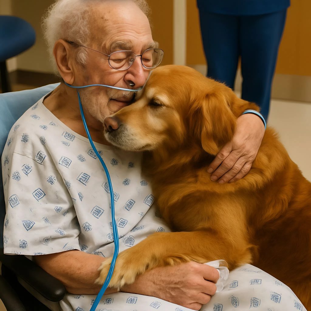 Entrò in silenzio, camminando piano sul pavimento freddo dell’ospedale. Il suo pelo dorato brillava sotto le luci. Nessun abbaio. Nessun salto. Solo uno sguardo consapevole, quasi umano.