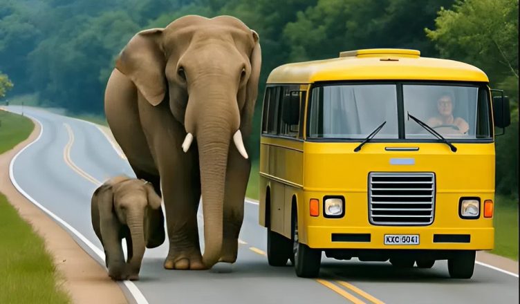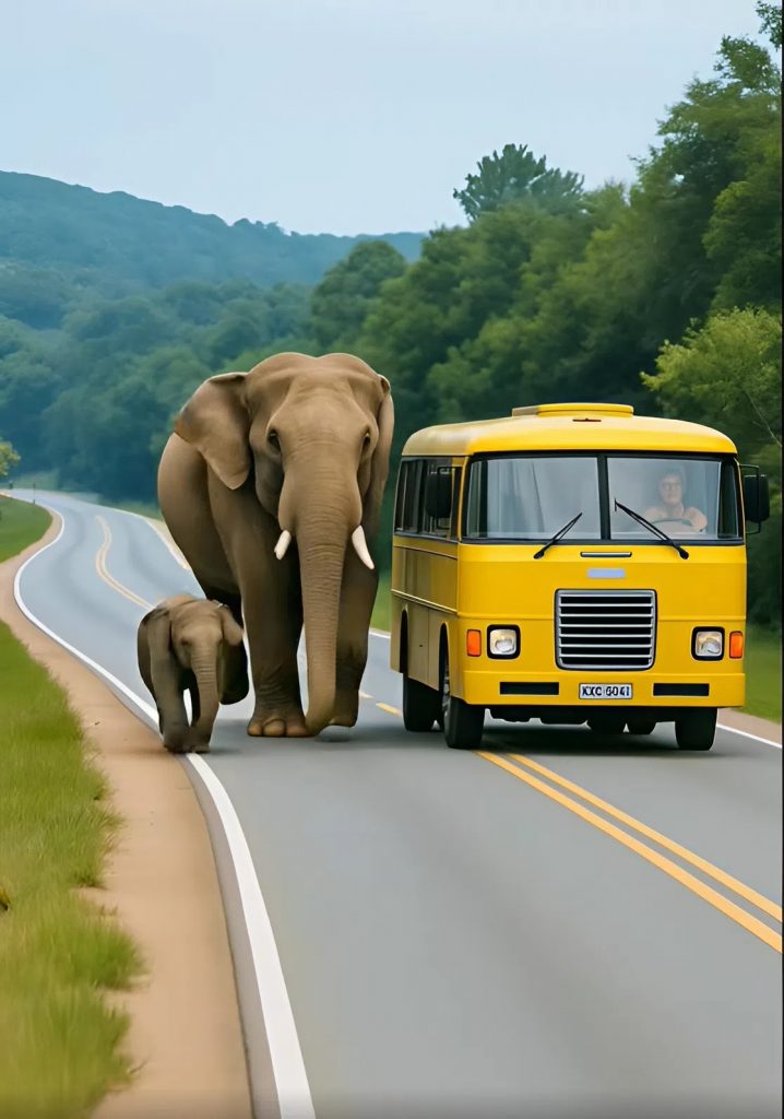 Davanti, nel mezzo della carreggiata, l’autista notò due grandi sagome. Ridusse la velocità, strinse gli occhi per vedere meglio. Un elefante adulto. Accanto a lui, un cucciolo. Immobili. Fermi in mezzo alla strada, come se aspettassero qualcosa.