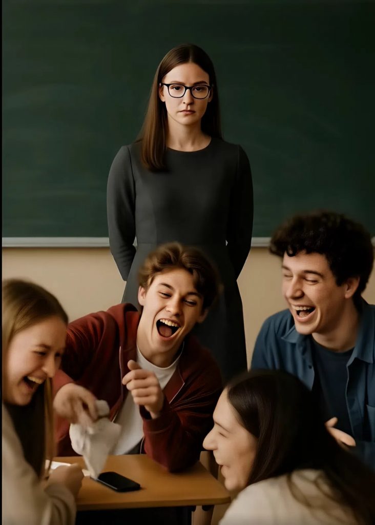 Qualcuno riprodusse dal telefono il verso di un asino. Un aeroplanino di carta le colpì la spalla. Alcuni chiacchieravano a voce alta, altri lasciavano cadere apposta i libri, altri ancora scrollavano TikTok sotto gli occhi di tutti.
