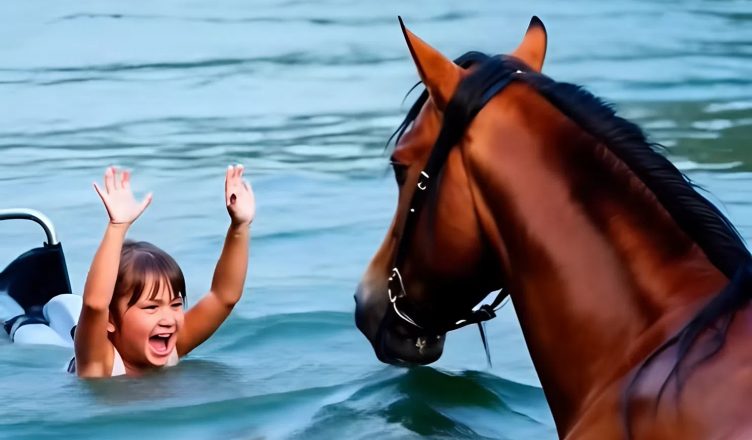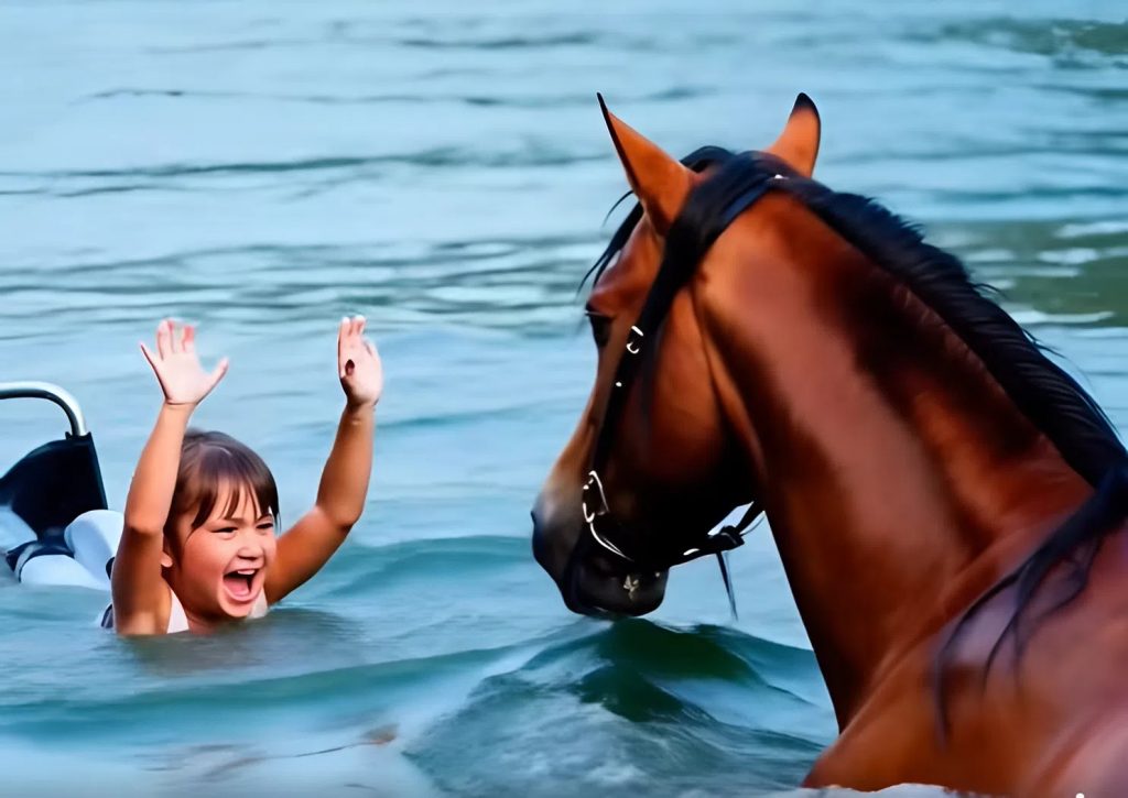La corrente cercava di trascinare la bambina sul fondo, ma il cavallo, muovendo le zampe con forza, si immerse sotto la superficie. Afferrò con i denti una cinghia della sedia a rotelle e tirò con tutte le forze. I secondi di lotta contro l’acqua sembravano un’eternità.