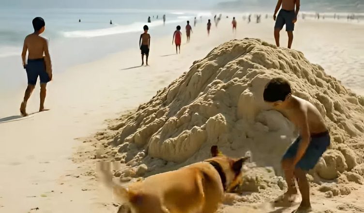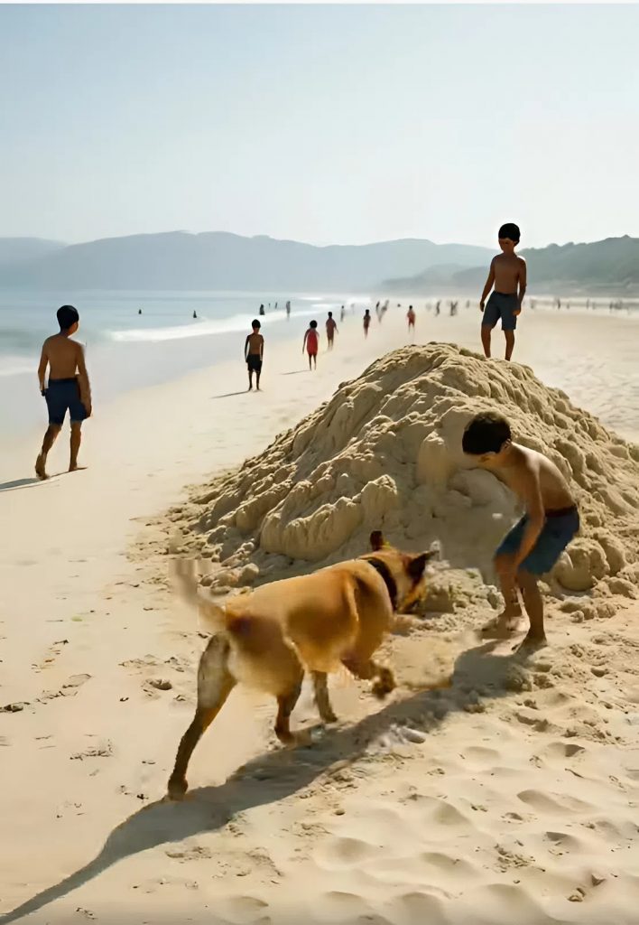 Il cane si fermò bruscamente, irrigidendosi come se avesse percepito qualcosa. I suoi occhi si fissarono su un grande mucchio di sabbia poco distante. Era costruito in modo approssimativo, probabilmente dai bambini che lo avevano lasciato per correre in acqua. Prima che l’uomo potesse reagire, il cane scattò in avanti. Il guinzaglio scivolò dalla sua mano e l’animale corse verso il mucchio.