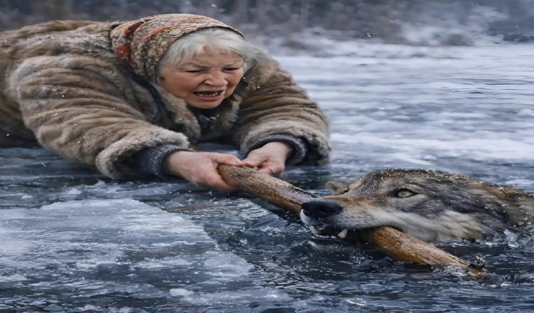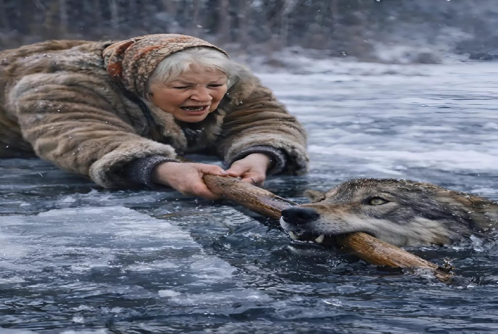 Le loup montra brièvement les crocs, mais il n’avait plus la force d’attaquer. Son instinct de survie prit le dessus. Il agrippa la branche de ses pattes avant. La femme tira de toutes ses forces. Ses bras tremblaient, son dos la faisait souffrir, la glace craquait dangereusement… puis, dans un ultime effort, le corps lourd du loup glissa enfin sur la surface gelée.