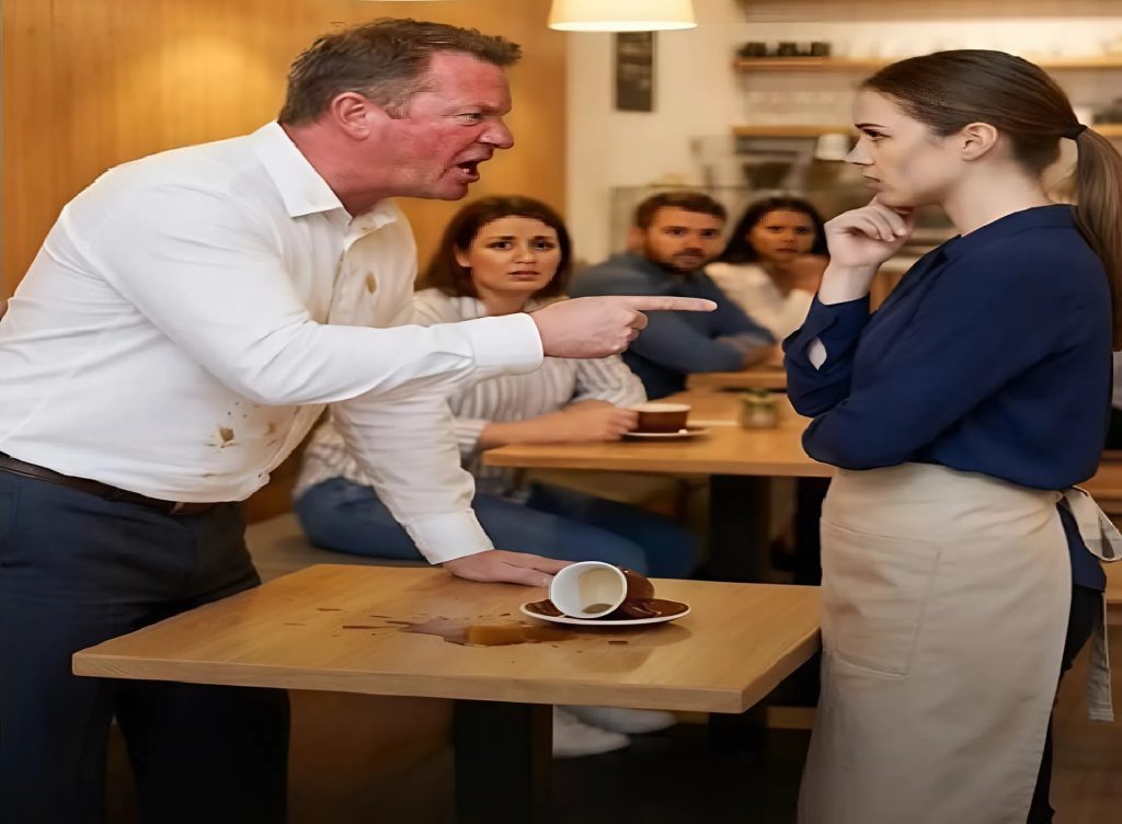 — « Vous êtes totalement incapable ou quoi ?! » cria-t-il aussitôt. « Vous venez de renverser du café sur le propriétaire du restaurant ! Comment a-t-on pu vous embaucher ? »