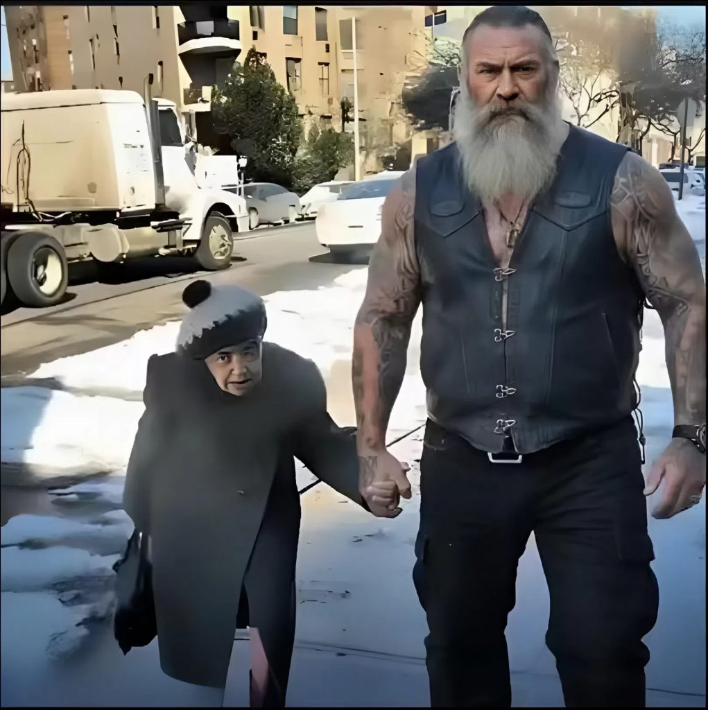 Devant elle se tenait un motard typique : grosses bottes, gilet en cuir, tatouages sur les bras et le cou. Il ressemblait plus à quelqu’un qui sortait d’un bar bruyant qu’à une personne venue aider.