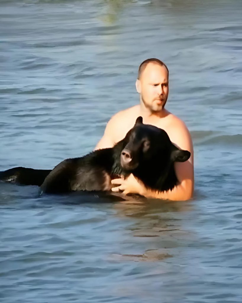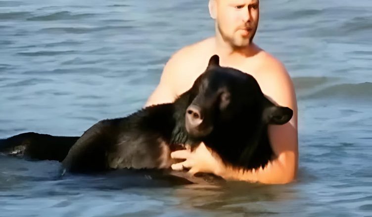 La scène était presque irréelle : un homme et un énorme ours nageant côte à côte au milieu des vagues. Malgré la force de l’eau, l’homme continuait de l’aider en le dirigeant doucement vers la plage.