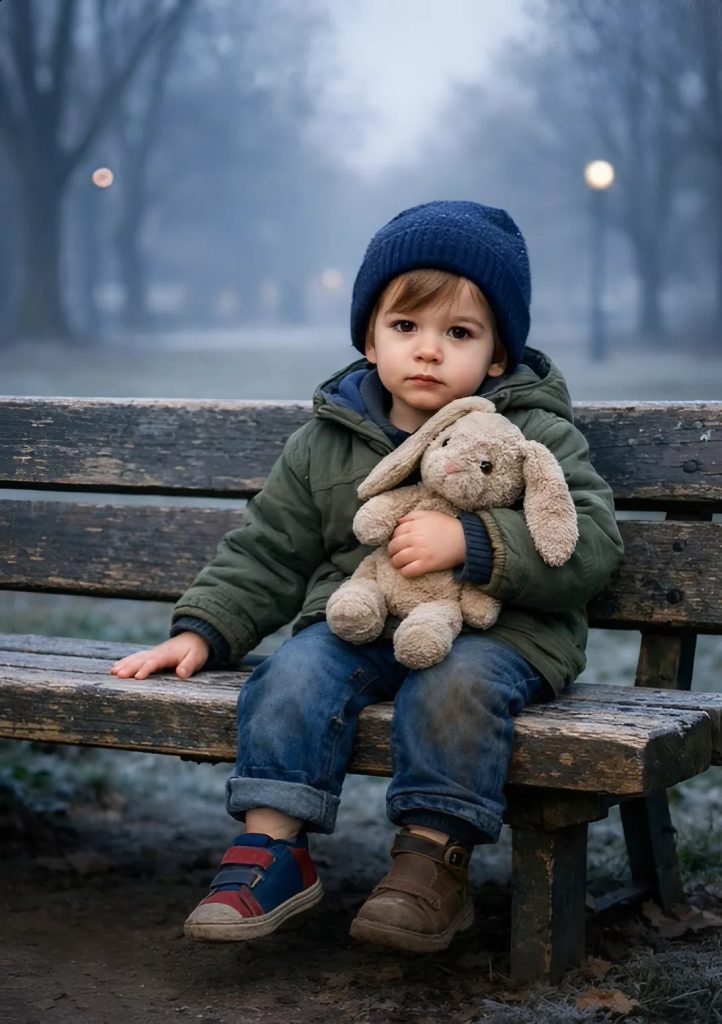 Il était 7 h 15. L’air du parc était encore froid après la nuit. Je faisais mon jogging habituel quand je l’ai vu de nouveau. Comme chaque matin, il était là. Ses jambes étaient trop courtes pour toucher le sol, ses chaussures semblaient trop grandes pour lui, et il serrait contre lui un vieux lapin en peluche — son unique compagnon.