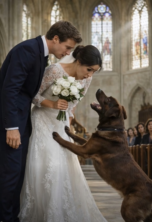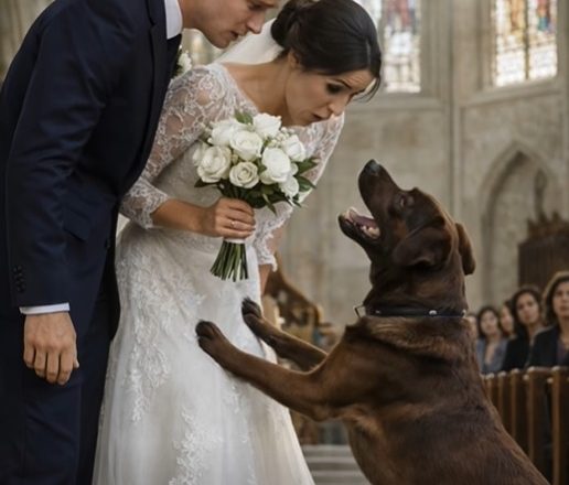 En une fraction de seconde, il se jeta sur la robe, attrapa le tissu et tira violemment la mariée en arrière. Les aboiements devenaient de plus en plus forts, presque hystériques. Le marié tenta d’intervenir, mais le chien ne réagissait à personne — comme s’il percevait quelque chose d’invisible pour les autres.